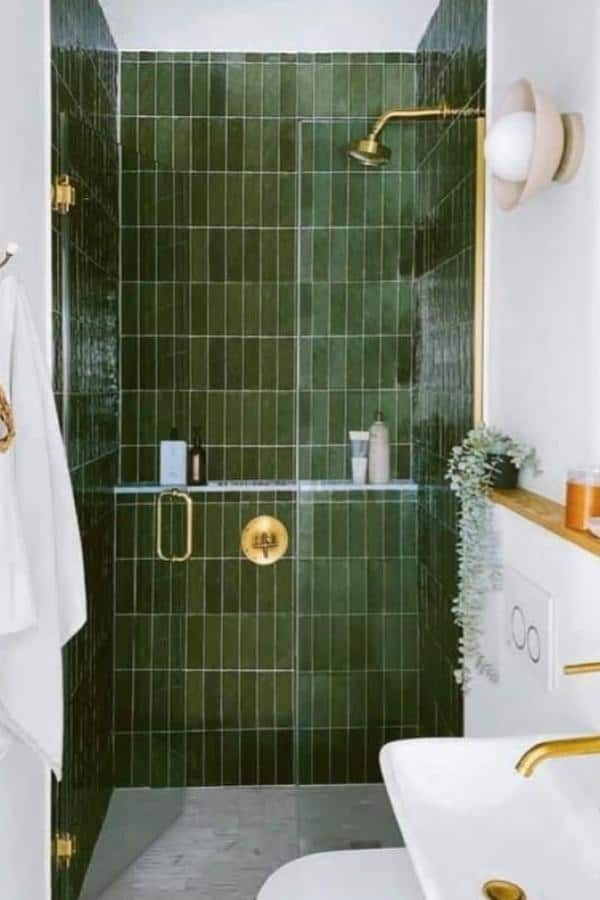 Rich green vertical tiles naturally elongate shower walls, enhancing height in tight quarters. Paired with brushed gold fixtures, the result feels indulgent and refined.