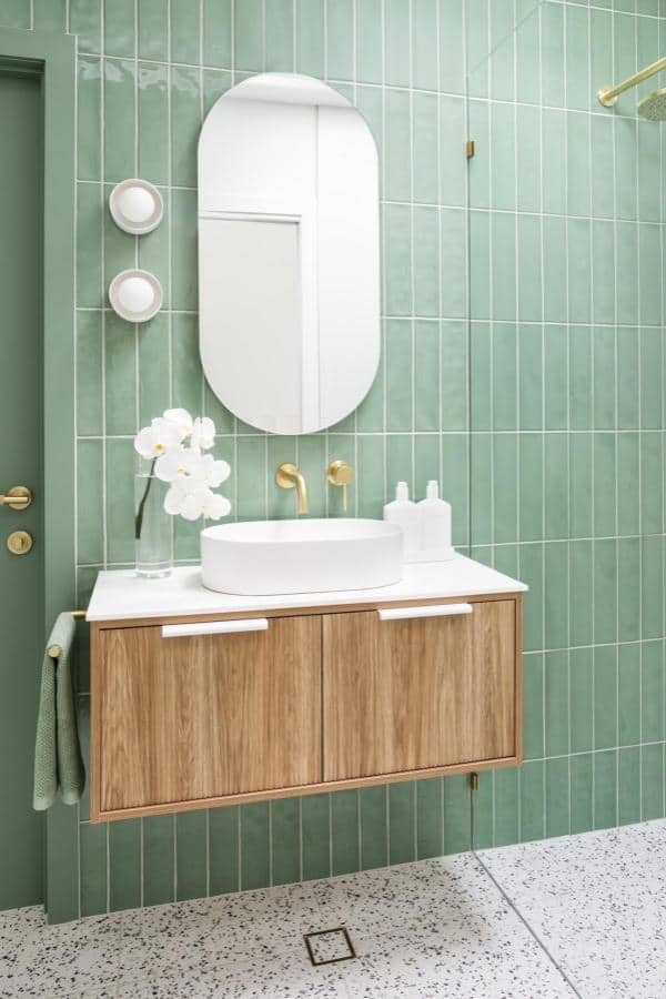 Vertical mint tiles feel fresh and invigorating, especially when accented with matte gold fixtures. A floating wood vanity balances cool tones with warmth.