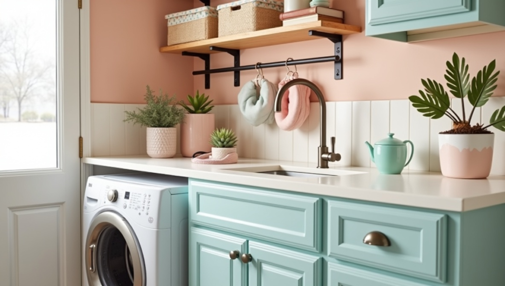 Charming utility rooms combine visual appeal with practical layouts. Thoughtful design, cheerful accents, and coordinated storage make the space inviting and functional. Small decorative touches, like colorful bins or elegant hooks, add personality while maintaining organization. This setup ensures the room feels welcoming and stylish while serving its practical purpose. Charming utility rooms are perfect for those who want a compact space to be both efficient and aesthetically pleasing, making daily chores more enjoyable.