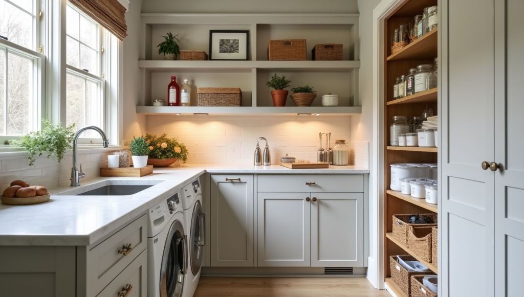 A pantry-style utility room is perfect for maximizing storage and organization. Shelving, pull-out drawers, and labeled containers make it easy to keep supplies tidy. This setup allows you to store everything from cleaning products to pantry items efficiently, ensuring no space is wasted. A pantry-type design enhances functionality while keeping the room visually clean. It’s an ideal solution for small spaces where organization and accessibility are essential, turning a compact utility room into a highly practical and efficient area.