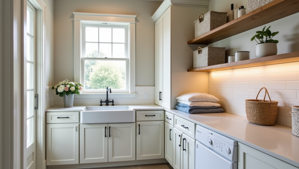 A lovely utility room focuses on charm, aesthetics, and functionality. Soft colors, attractive storage solutions, and elegant finishes make the space inviting and practical. This setup ensures that even small areas feel warm and organized, with attention to detail that elevates the overall look. Lovely utility rooms are visually appealing while remaining highly functional, giving you a space that’s both efficient and beautiful. It’s an ideal solution for those seeking style and usability in a compact environment.
