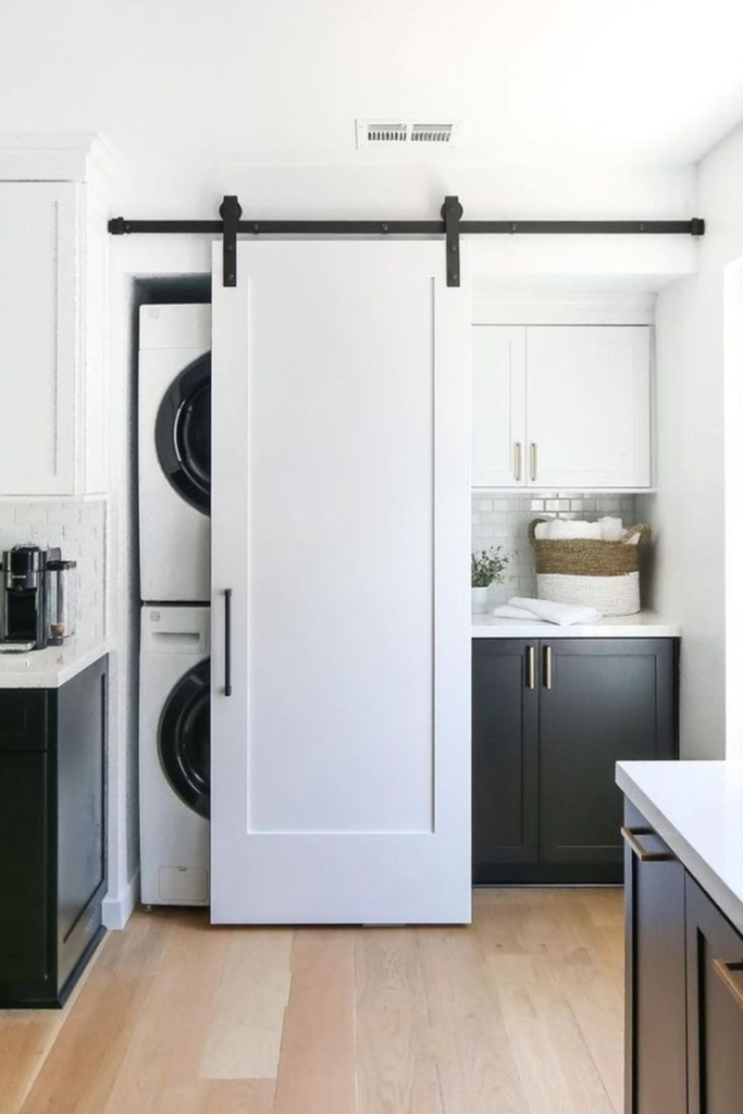 A sliding door is a smart choice for a small utility room. It maximizes space while keeping the room accessible and organized. Sliding doors tuck neatly out of the way, creating a clean, streamlined look without compromising functionality. Choose a simple wooden or frosted glass design to blend with your home’s aesthetic. This setup not only improves the first impression as you enter the room but also adds a modern, practical touch, making the space feel polished and effortless.