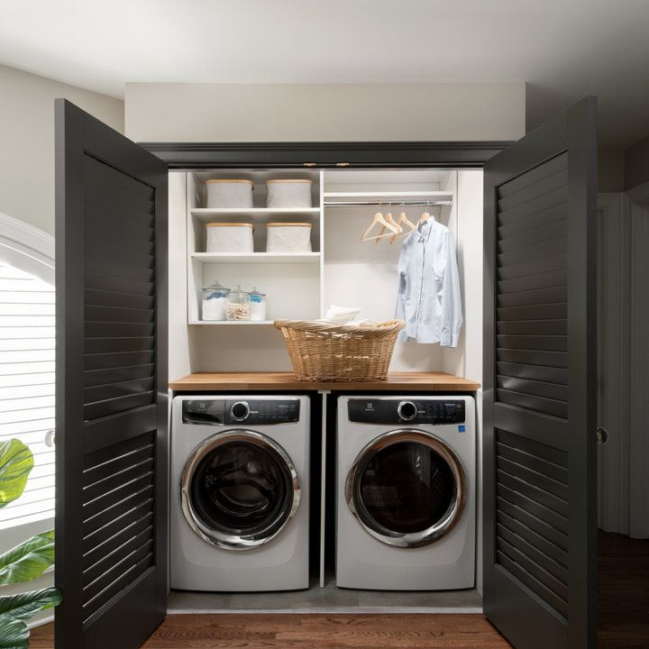Chic utility rooms are stylish and modern, offering a sleek, visually engaging design. Coordinated storage, clean finishes, and subtle decorative elements make the space feel polished. Functional necessities are neatly organized, and thoughtful accents like metallic hardware or minimalist shelving elevate the room. This setup is perfect for those who want practicality without sacrificing style. A chic utility room feels inspiring and sophisticated while remaining functional, giving a compact space a luxurious, contemporary edge.