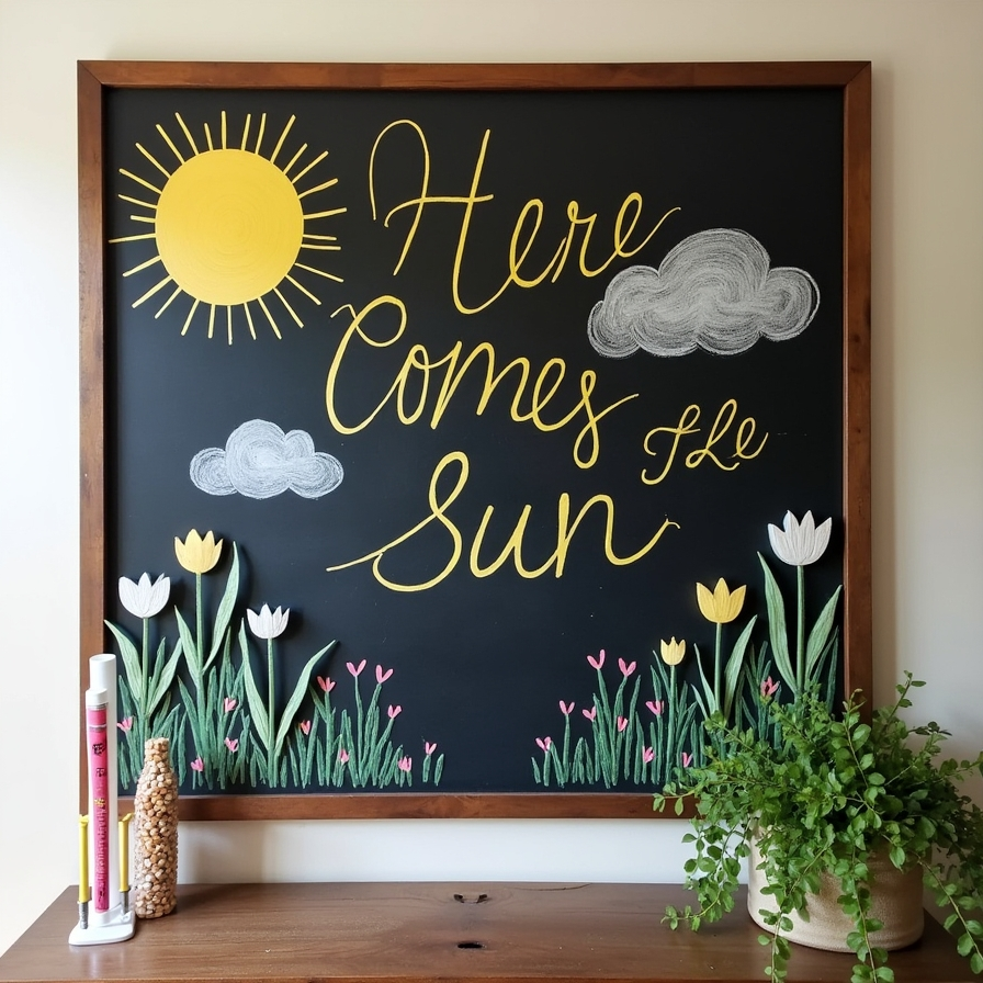 The sun is a symbol of warmth and new beginnings, making it perfect for spring chalkboard ideas. By drawing a bright sun along with complementary elements like clouds or flowers, you can create a cheerful focal point for your space. This design can incorporate vibrant yellows, soft pastels, or metallic chalks for added visual interest. The sun motif captures the energy and optimism of spring, making it an ideal way to celebrate the season on a chalkboard. It is simple yet impactful, instantly brightening any room.