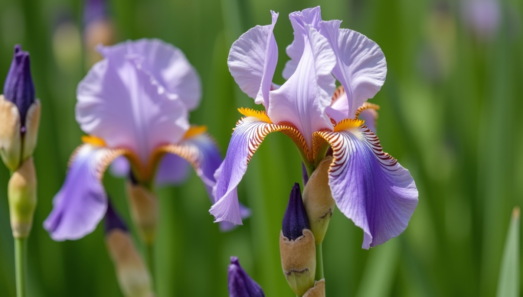 Irises are striking flowers known for their unique shape and bold presence in garden landscapes. Their sword-like leaves and intricate blooms make them a popular choice for borders and decorative planting. Available in a wide range of colors and sizes, irises can bloom from early spring to early summer, depending on the variety. These plants multiply over time, ensuring a fuller display each year. When planting, it’s important to keep their rhizomes close to the soil surface rather than burying them too deeply. Irises thrive in full sunlight and also attract pollinators like bees and hummingbirds, adding life and movement to your garden.