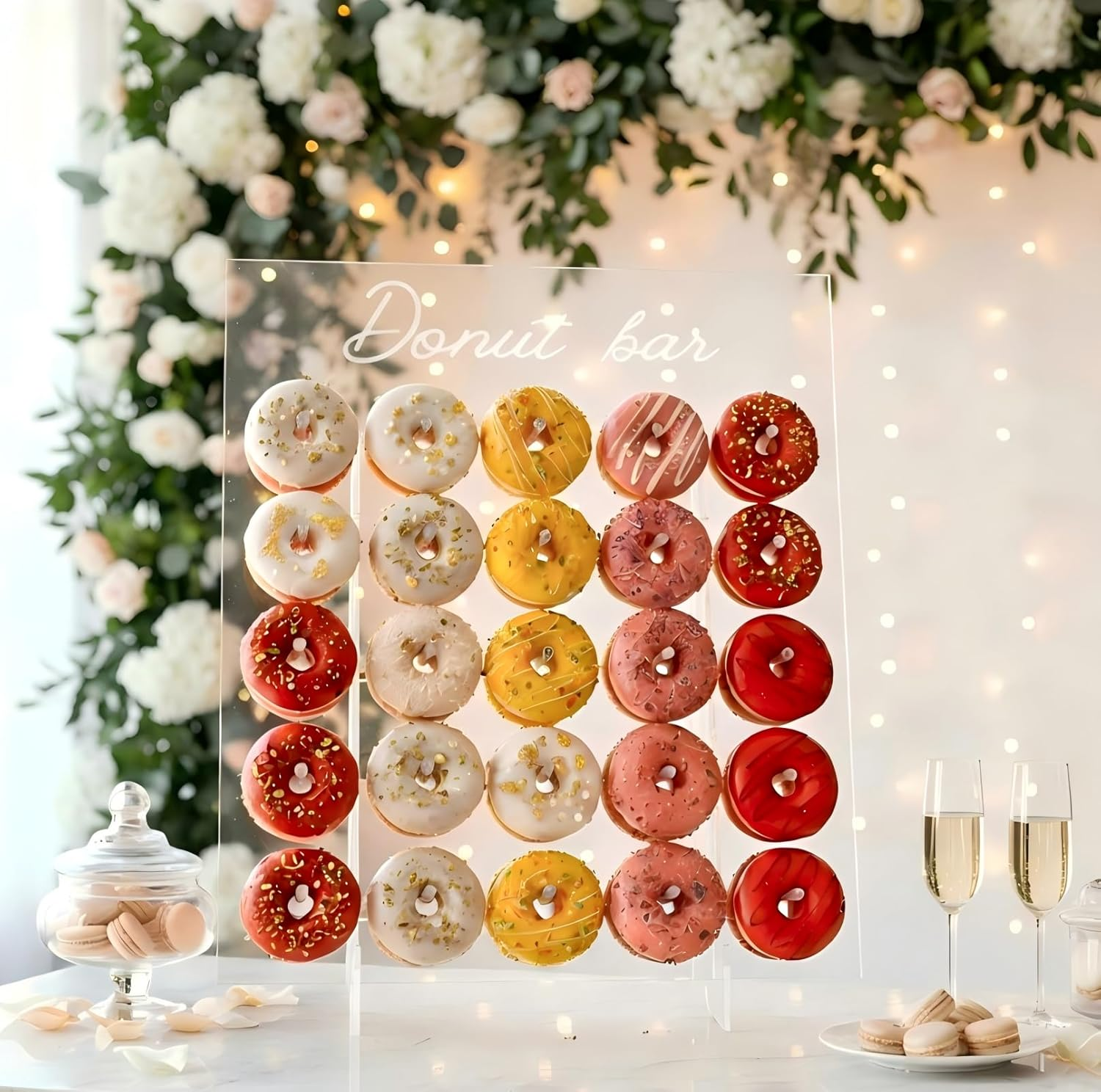 Show off up to 50 donuts or treats on this sleek, crystal-clear acrylic wall. With precise spacing, a sturdy 8-inch base, and easy assembly, it’s perfect for weddings, parties, or any occasion—reusable, stylish, and mess-free.