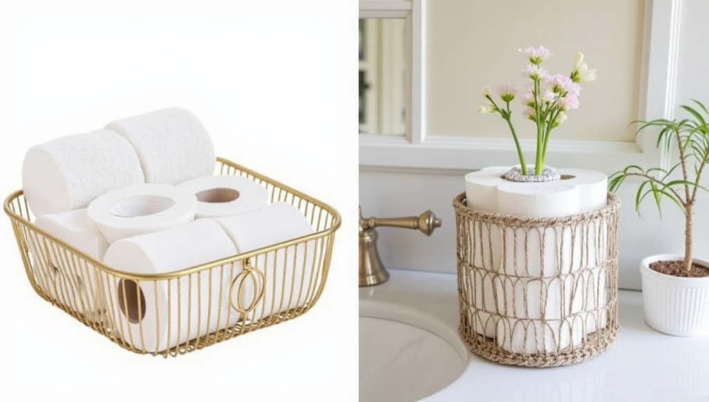 A small basket can turn a practical necessity into a chic accent. Use a wire or woven basket to hold extra toilet paper rolls or a rolled hand towel. Neutral tones like beige, white, or gray keep the look sophisticated and versatile. This method keeps backups within easy reach while maintaining a tidy appearance. You can even layer the rolls or add a small decorative item to make it feel intentional and polished rather than purely functional.