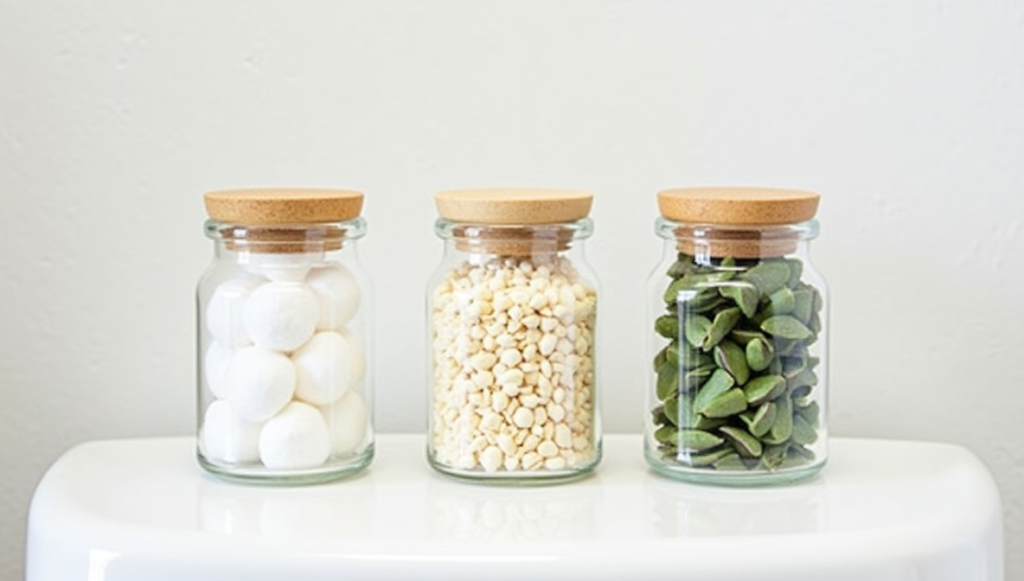 Three small glass jars instantly elevate the bathroom’s style while providing practical storage. Fill one with cotton balls, another with bath salts, and the last with Q-tips or eucalyptus sprigs. This setup creates a miniature spa atmosphere that feels both organized and luxurious. Arrange the jars side by side for symmetry or staggered for visual interest. It’s an affordable DIY approach that brings charm, function, and a touch of wellness-inspired elegance to even the smallest bathrooms.