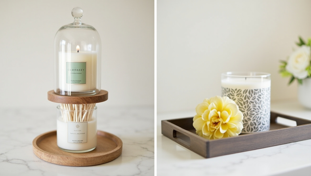 Stacking a candle with a small cloche of matches or a decorative matchbox creates a charming, functional display. A scented candle adds warmth and fragrance, while the cloche keeps matches tidy and stylish. This small arrangement feels intentional and curated, perfect for creating a spa-like vibe. Lighting the candle occasionally enhances the experience, turning an everyday space into a relaxing retreat. Pairing a candle with complementary items on a small tray can make the arrangement feel even more cohesive.