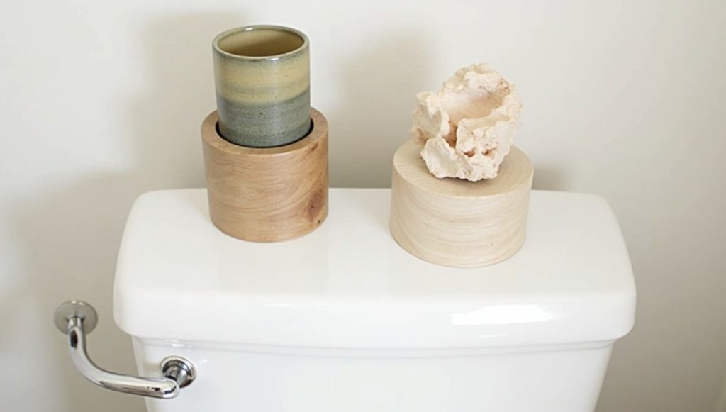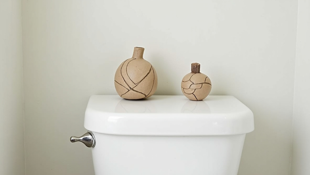 Add an artsy vibe with a small ceramic knot, abstract sculpture, or geometric figure. Keep the surrounding space minimal so the piece becomes the focal point. Sculptural objects bring texture, dimension, and personality to your bathroom. Choose materials like ceramic, wood, or metal for a subtle yet impactful effect. A single statement object on the toilet tank elevates the room without overcrowding it, creating a gallery-like feeling in a small, often overlooked space.