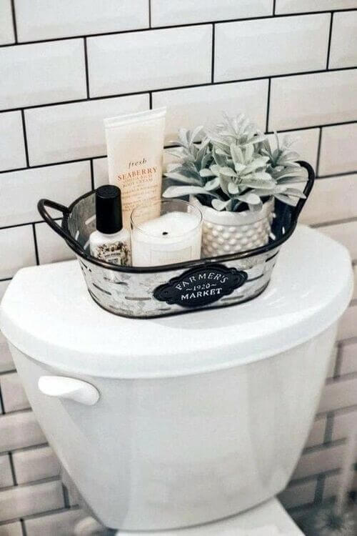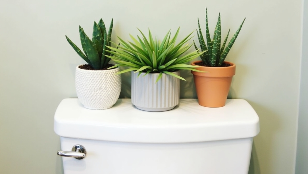 A small faux plant is a low-maintenance way to bring life and color to your toilet tank. Succulents, cacti, or leafy faux greens stay vibrant year-round without care. Their presence instantly softens the space and adds visual interest. Place the plant in a decorative pot or a neutral container to match your bathroom’s color scheme. Even a single small plant makes the area feel lively and thoughtful, proving that greenery doesn’t have to be high-maintenance to be stylish.