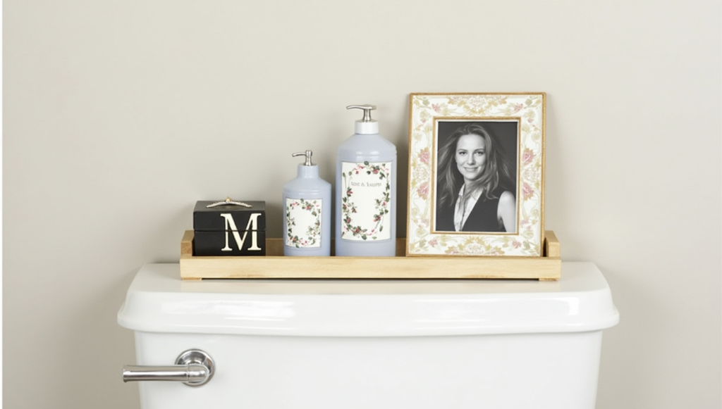 Adding a small personal element makes toilet tank decor uniquely yours. Frame a tiny photo, display a monogrammed box, or include a souvenir from a trip. Personal items add warmth and character without overwhelming the space. Pair with neutral or complementary pieces to keep the arrangement cohesive. Even a single meaningful object can make your bathroom feel thoughtfully styled, reflecting your personality while remaining visually balanced and harmonious.