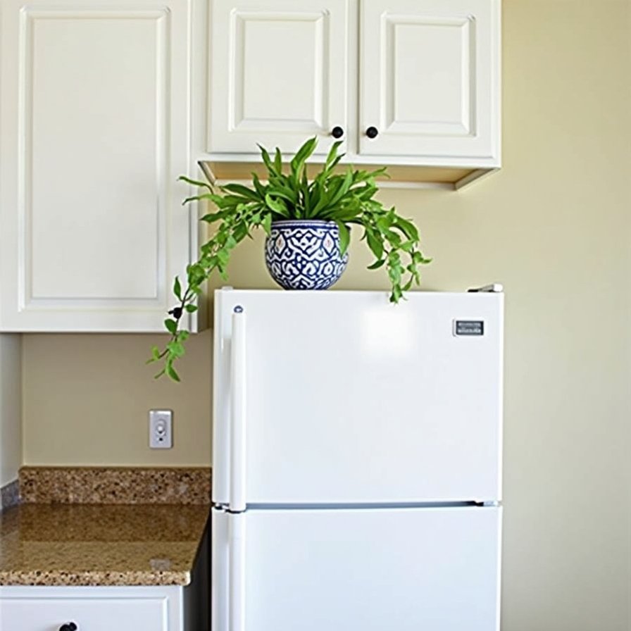 Sometimes all it takes is one carefully chosen piece to transform the fridge top. A single small plant or greenery arrangement adds just enough visual interest to prevent the area from feeling empty. This minimalist approach works especially well in kitchens with limited space or a clean-lined aesthetic. Keep the surrounding area clear and uncluttered to highlight the plant as a focal point. A subtle green accent provides freshness, texture, and life without competing with other elements in the kitchen.
