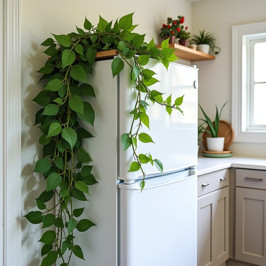 Letting greenery spill slightly over the edge of the fridge introduces softness and movement. This technique works especially well for taller, boxy fridges, as it breaks up the vertical lines. Keep surrounding items minimal to maintain focus on the plant. You can choose trailing vines or cascading faux plants to add a dynamic, organic feel. This simple touch creates a natural, airy look that brings energy and life to an otherwise static kitchen corner.