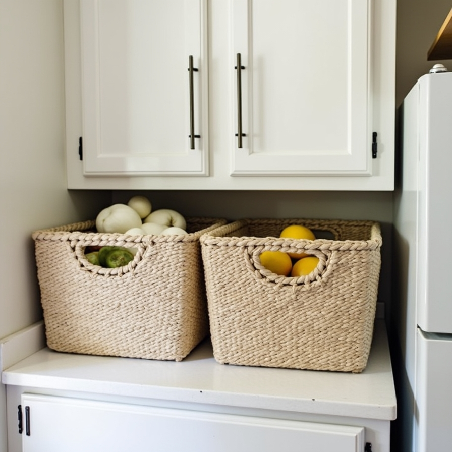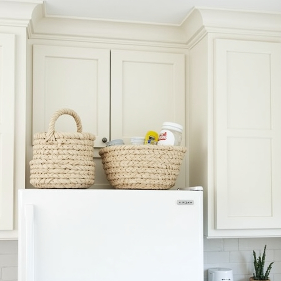 Light-colored baskets provide subtle storage while keeping the fridge top visually light. Neutral tones, such as beige or white, blend easily with cabinets and maintain a clean aesthetic. Use them to store miscellaneous kitchen items without making the space feel crowded. This approach is perfect if you prefer minimal decor, as it provides organization while staying understated. Neutral baskets help maintain an airy, balanced look, ensuring that the top of your fridge complements the rest of the kitchen effortlessly.