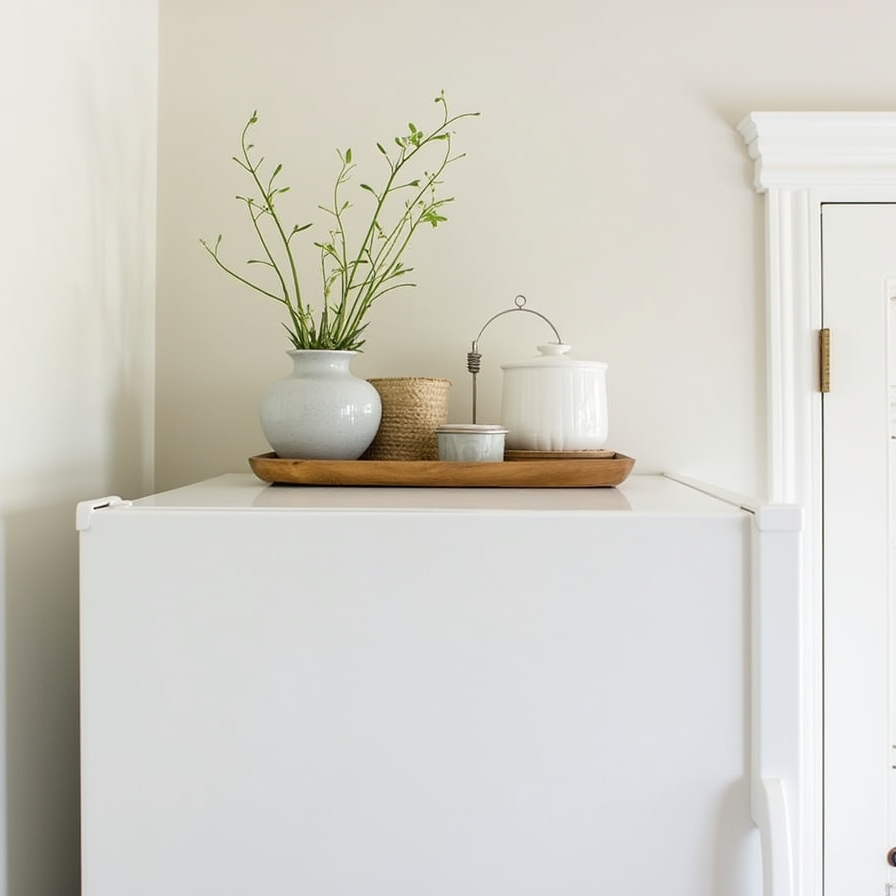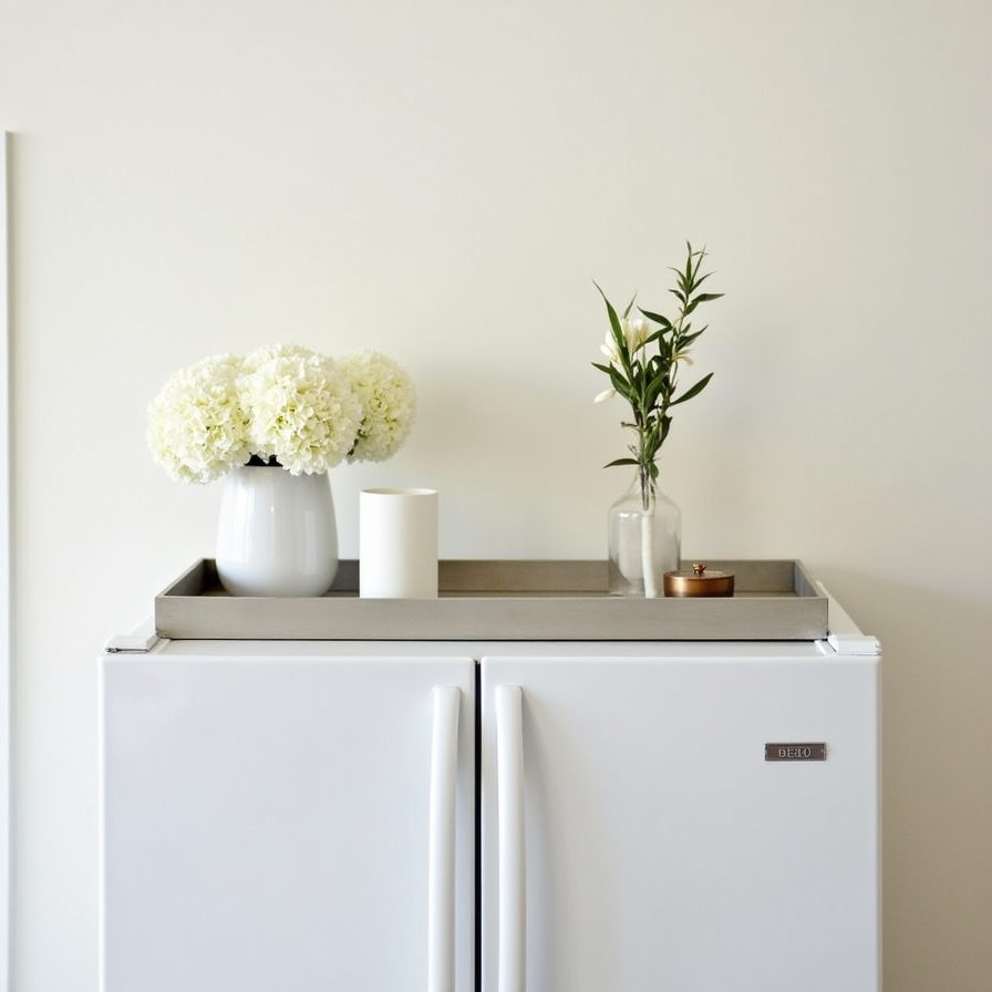 Using a small tray on top of the fridge helps keep everything organized and contained. Add just one or two decorative items, such as a small vase or candle, to create a polished display. Trays prevent the area from becoming a catch-all for miscellaneous objects, keeping the fridge top clean and intentional. This approach works well for adding personality while maintaining a minimal aesthetic, making it simple to rotate seasonal or personal decor without disrupting the overall balance of the kitchen.