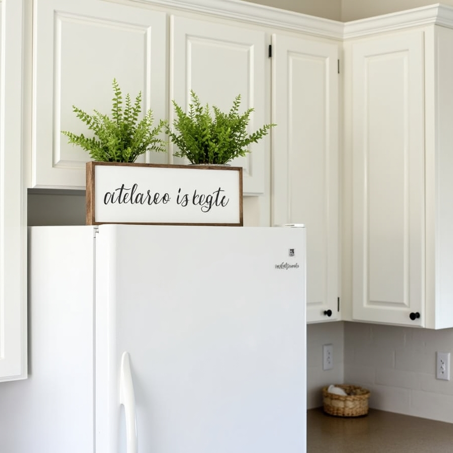 Pairing a small plant with a decorative sign is a stylish way to add personality. Choose neutral tones for the sign to keep the look balanced and subtle. The greenery softens the edges, while the sign introduces a personal or playful touch. This combination creates visual interest without overwhelming the fridge top. It’s a simple, versatile arrangement that works in most kitchen styles, offering a curated look that’s approachable and easy to update with new seasonal or personal items.