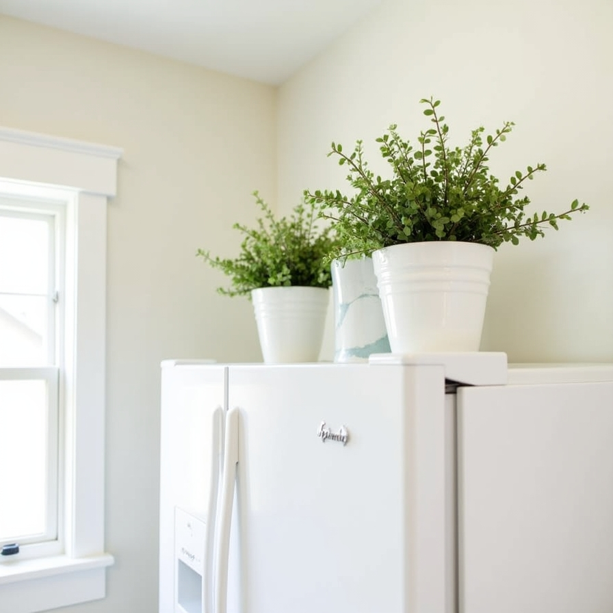Sometimes less is more. A single plant or a small pair is all you need to enhance the fridge top without overwhelming the area. Faux plants are a great alternative if low-maintenance greenery is your priority. Placing one plant in a decorative pot adds life and a pop of color while keeping the look clean. This approach works especially well in smaller kitchens, providing a simple and stylish accent without drawing attention away from the overall design.
