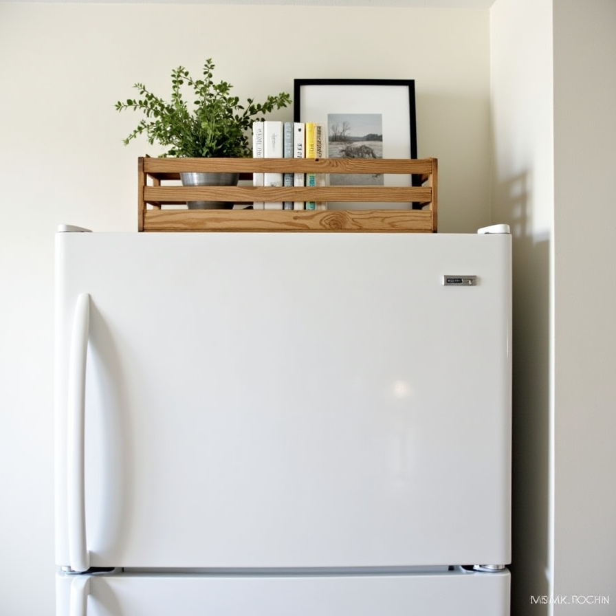 A low wooden crate can turn your fridge top into a mini vignette. Add a framed print, a couple of small books, and some greenery inside the crate. Keeping items contained creates a cohesive and curated look, preventing the area from appearing cluttered. This method allows you to mix functional storage with decorative touches. It also adds texture and depth to the space, making the fridge top feel intentional and integrated into the overall kitchen design.