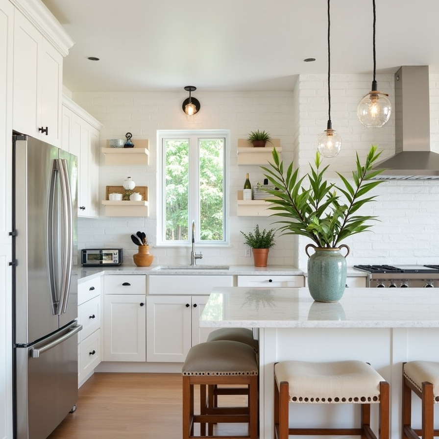 If you have built-in shelves above the fridge, styling them lightly can make a big difference. Combine a few small decor pieces with functional items like dishes or jars. Keep the arrangement simple to avoid a cluttered appearance. Open shelving allows you to display personal touches, seasonal accents, or minimal decorative objects while maintaining accessibility. Less is more in this scenario—prioritizing space, balance, and functionality ensures your shelves feel curated, practical, and aesthetically pleasing.