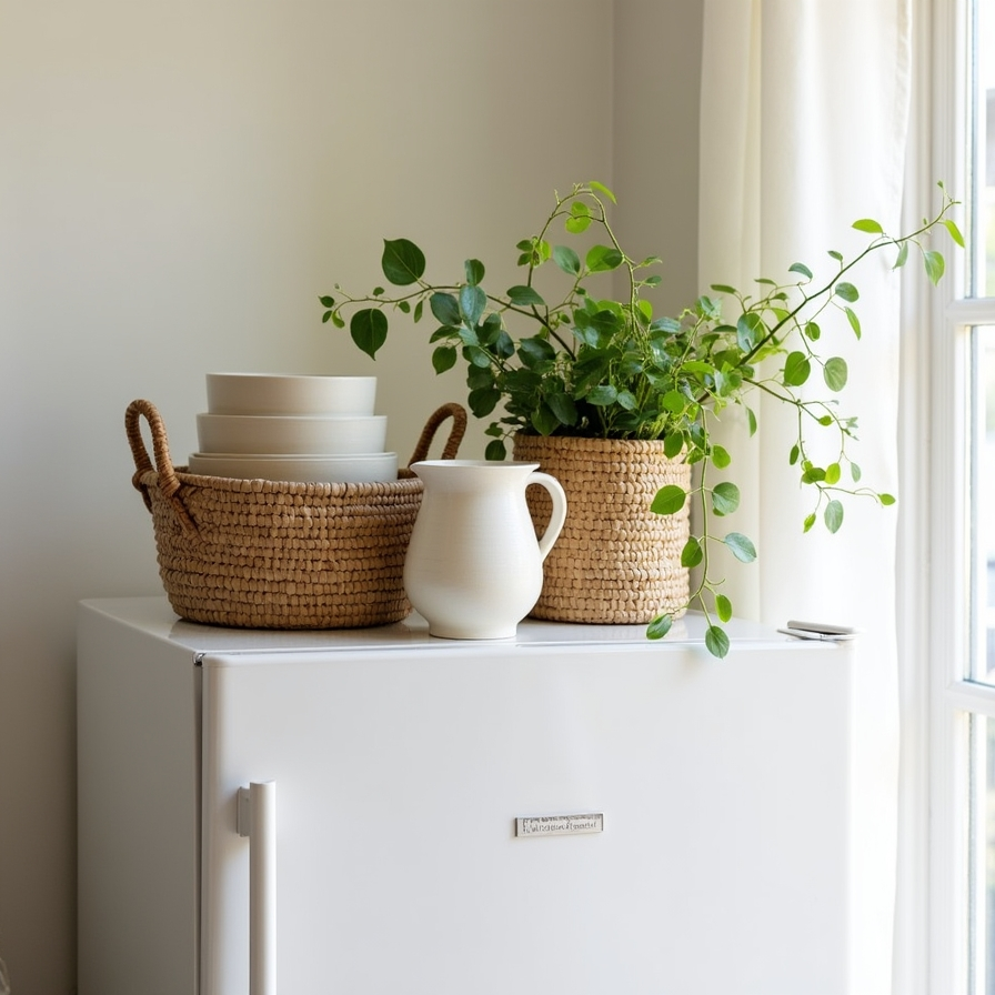 Woven baskets are ideal for keeping the fridge top both stylish and functional. Use matching baskets to hide items you don’t need daily, such as rarely used appliances or kitchen extras. Coordinated textures and neutral tones make the display feel intentional rather than random. Woven baskets also introduce warmth and texture, adding a natural element to the space. They keep your kitchen looking organized while offering a practical storage solution that blends seamlessly with your decor.