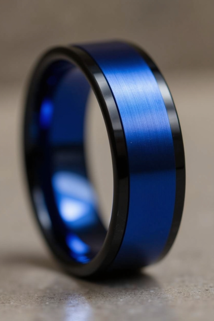 A black and blue tungsten promise ring is a sleek, modern take on a timeless symbol of commitment. The striking contrast between deep black and vibrant blue creates a masculine, contemporary look.