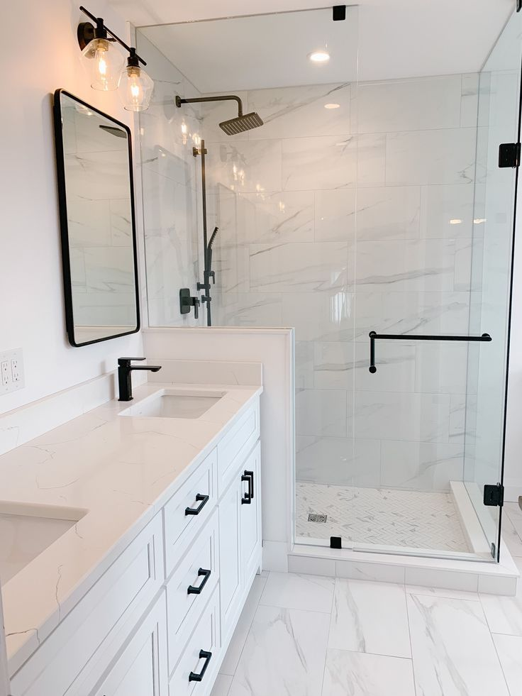 Bright white walls and fixtures can be paired with natural textures such as wood or stone to add warmth. Statement mirrors, artistic lighting, and plush accessories complete the look.