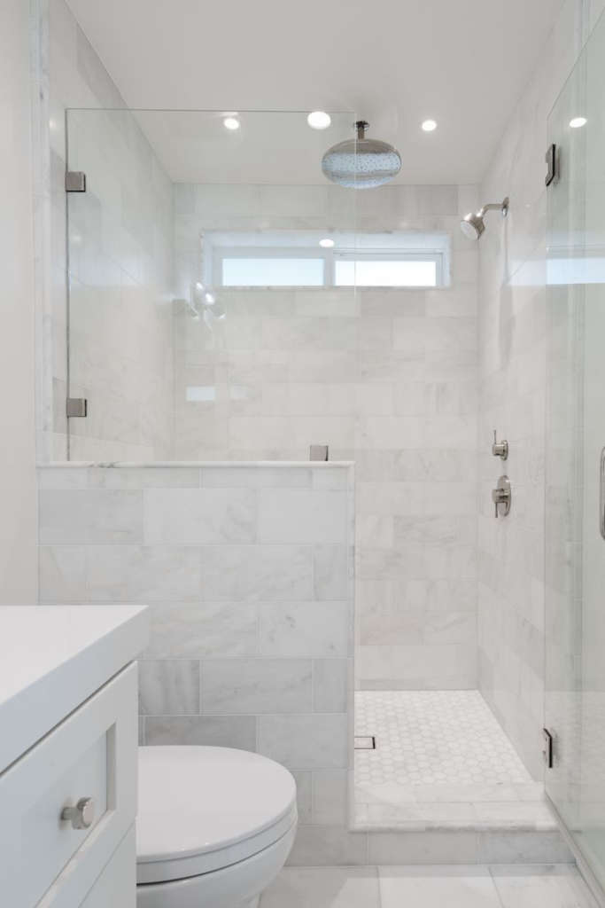 Bright white tiles, marble countertops, and polished fixtures create a space that feels open and inviting. The contrast of white with subtle accents—such as light wood, chrome, or brushed gold—adds a refined touch without overwhelming the design.