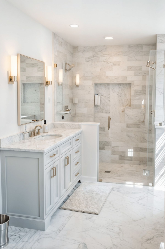 The result is a bathroom that is visually stunning, practical, and timeless—perfect for homeowners who want a space that balances beauty with comfort.